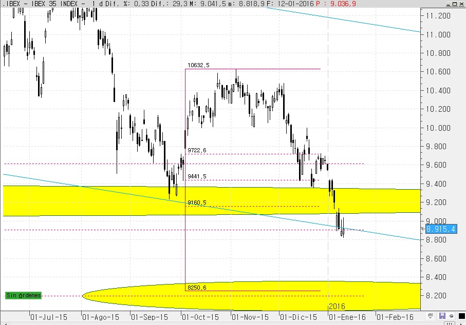 Objetivo por segundo impulso bajista en 8250 y lo que es peor de todo pérdida del soporte 9200 zonal, que una vez perdido pone de manisfiesto una más que preocupante debilidad.